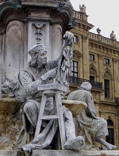 在主教宮正門口廣場中央的是法蘭克尼亞噴泉(Franconia Fountain)是由雷根特‧盧伯德‧馮‧巴耶爾(Regent Luipold von Bayern)王子所建的,噴泉基座是三組精雕細琢的人像石雕,分別描述是藝術、哲理、知識,中央矗立著左手持烏茲堡市徽的守護女神青銅雕像。